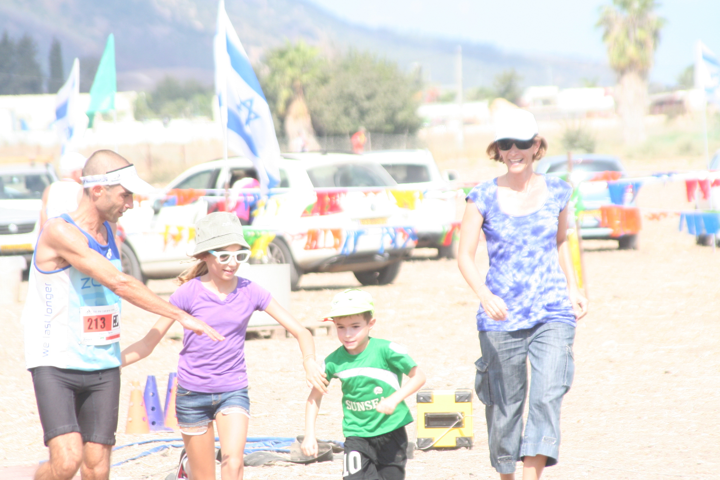 כ-400 מטרים לסיום אולטרה מרתון סובב עמק 2012 למרחק 61 ק"מ, בליווי המשפחה הקרובה. צילום: ד"ר מנשה רוזנפלד