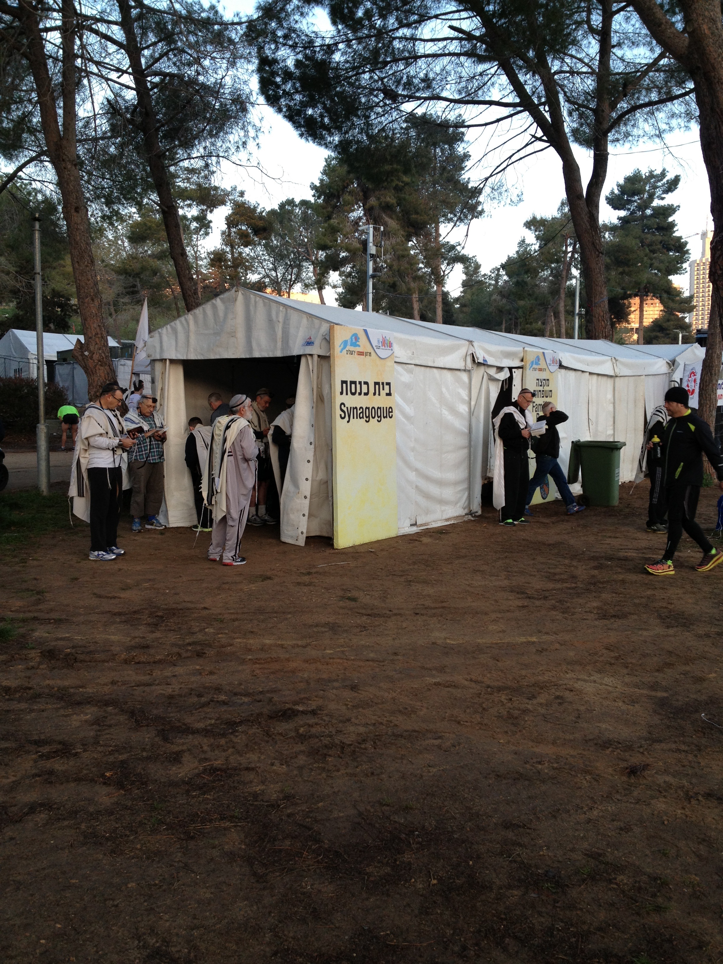 אף שהגענו מוקדם, רצים רבים כבר נמצאים במקום. חלקם מתפללים בבית הכנסת שהוקם במתחם. נראה לי שרק ירושלים יכולה לספק מראה כזה… האם הם מתפללים גם להצלחתם במרוץ?