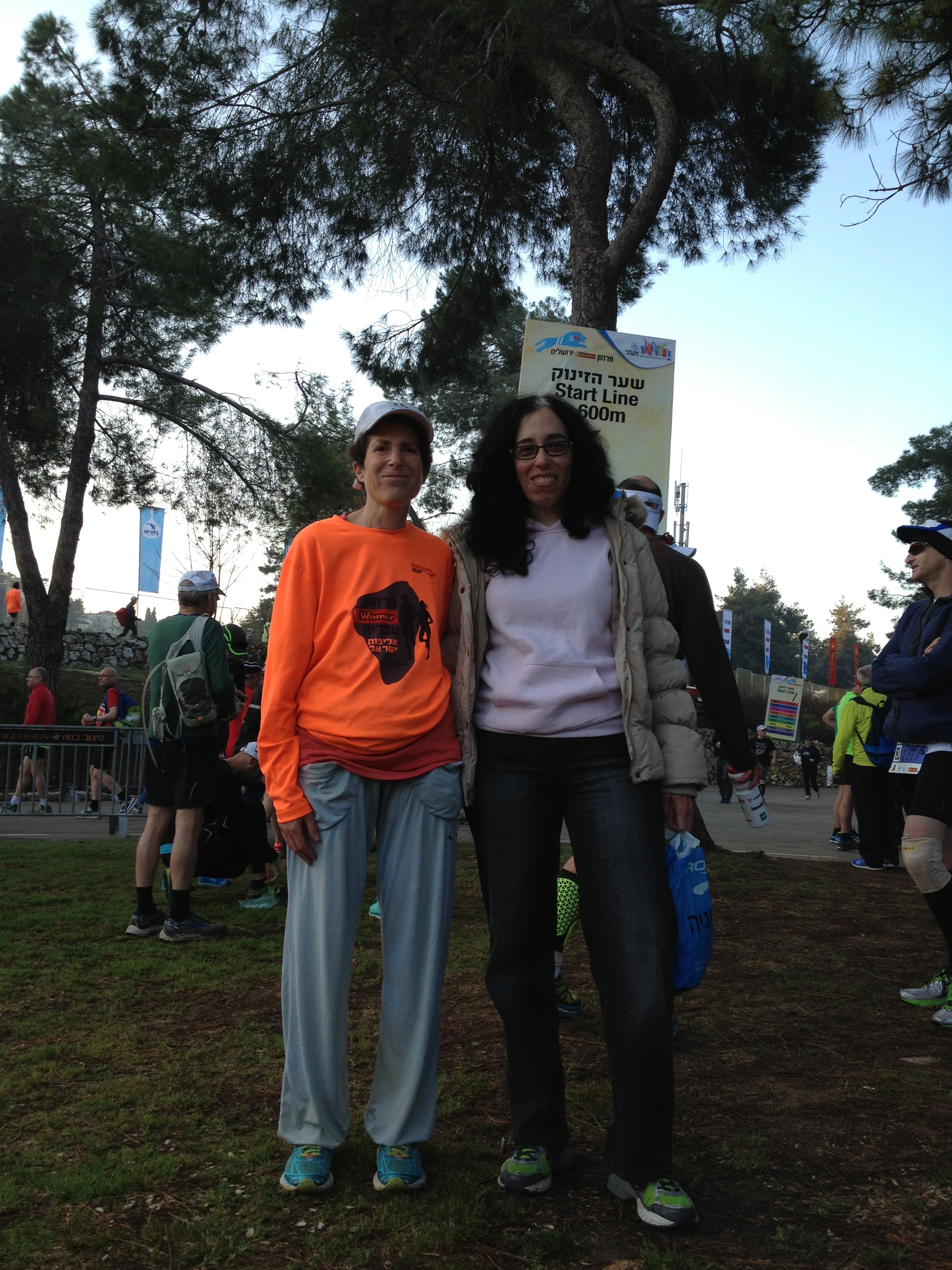 לירושלים אני מגיעה עם מירב, וזו הזדמנות טובה להשלים פערים ולהתעדכן בקורה בחייה. אנו בקשר טלפוני עם סוניה ודוד מנדלוביץ. מתברר שהם יצאו באיחור רב משום שלאחר שיצאו סוניה גילתה ששכחה את המשאף (היא אסטמתית) והם נאלצו לשוב לביתם לקחתו. אני מקווה שיגיעו בזמן, גם בשבילם וגם בשבילי. תכננתי לרוץ עם דוד, לאחר שסוניה אמרה לי שהמטרה שלו היא לרוץ 1.59. מתאים לי. יש לי ניסיון טוב בריצה עם דוד, שבחברתו רצתי למעלה מ-30 ק"מ באולטרה מרתון בסובב עמק.