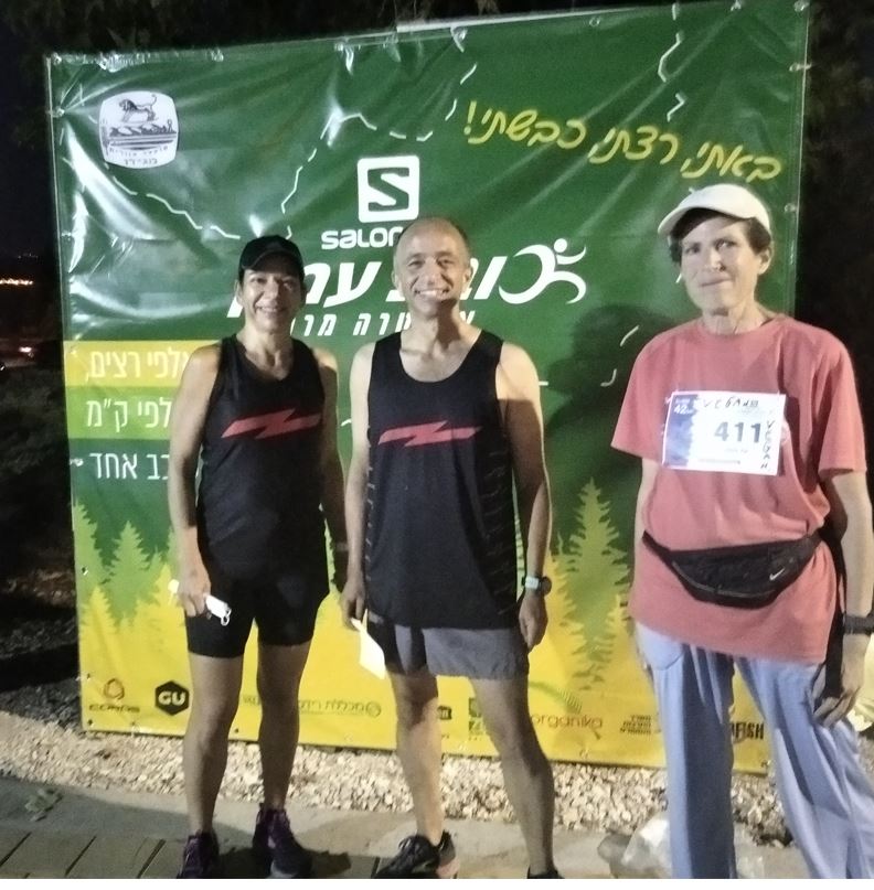תודה לעזר כנגדי, אישי היקר יריב גלבוע, שהשכים איתי בשעה שלוש וחצי כדי שנצא לדרכנו בארבע וחצי בבוקר. אני שותה ואוכלת לפי ההנחיות של המאמן מישאל דגן, אף שבדרך כלל איני אוכלת ושותה בבוקר לפני אימון. כשאנו מגיעים למתחם, אני מופתעת ממיעוט האנשים שבו. המוזיקה מבריחה את יריב חזרה למכונית, ואני נשארת לבד. חוויה שונה כל כך מחוויית הריצה לפני שנתיים – אז רצתי עם שמוליק הודס ועם בלהה מנדילוביץ את מקצה ה־33 קילומטר ונהניתי לכל אורך הדרך. כעת אני לבד, מחכה לזינוק. "פסס, פסס", אני מנסה לפתות חתול מזדמן לחבור אליי, אבל הוא מתרחק ממני בצעד גאה ואני נשארת בודדה כמו כלב. אפשר להבין אפוא את שִׂמחתי עת פגשתי את אפרת כרמלי-כלב ואת יוסי צחור מקבוצת הריצה שלי, תל אביב 100, שהתייצבו שניהם למקצה ה־33 קילומטר.